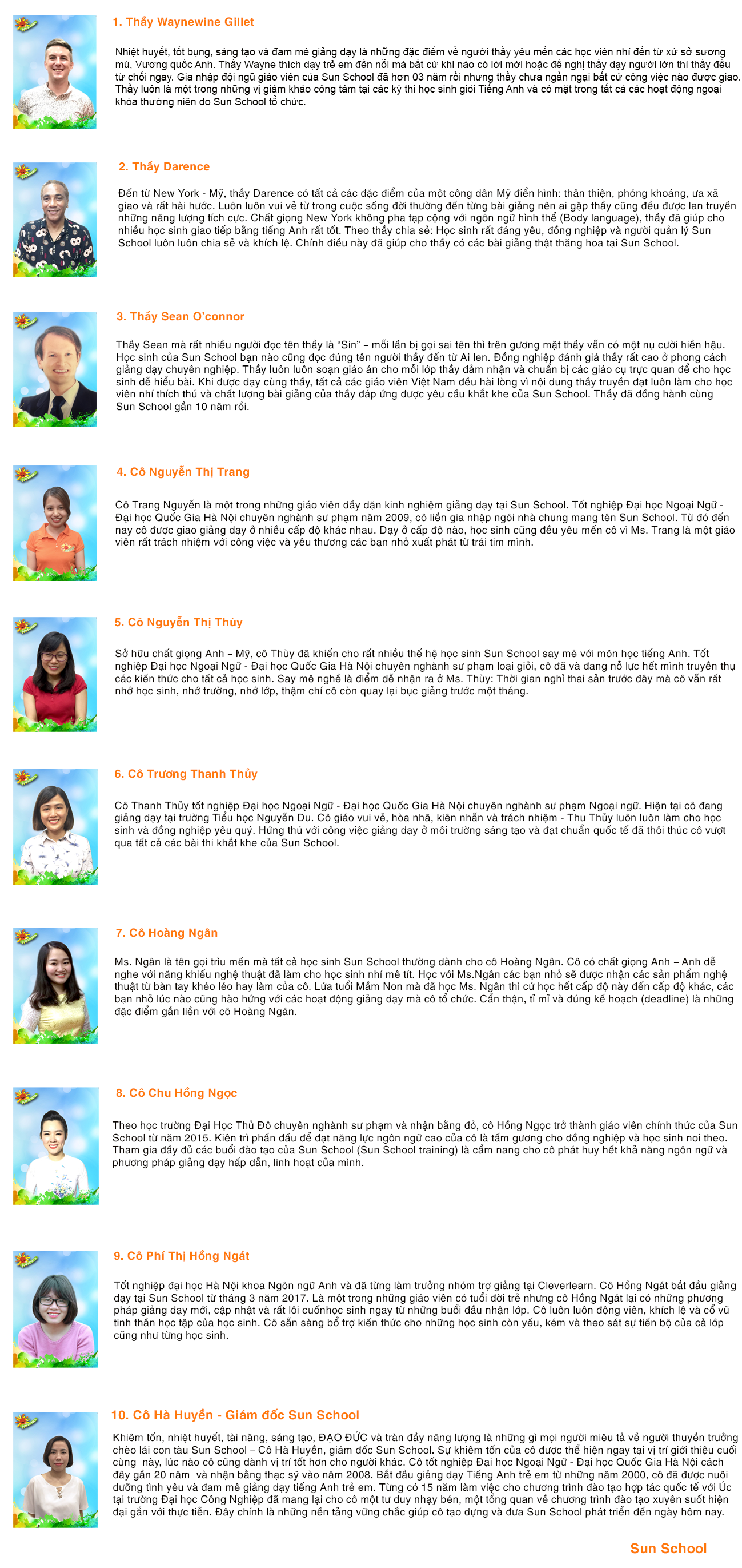 Đặc biệt là giáo viên nước ngoài đều có bằng đại học và trên đại học chuyên ngành giảng dạy và nghiệp vụ sư phạm phù hợp. Có thầy cô đã gắn bó với Sun School với các học viên đến gần 10 năm nay.