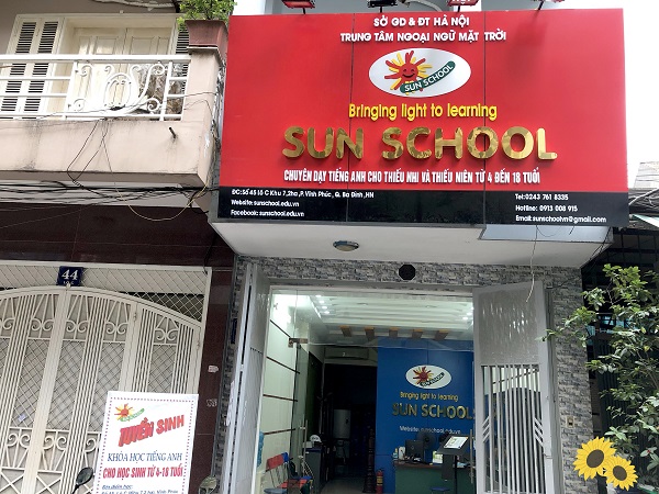 2 cơ sở của Sun School tại Số 45, Lô C, khu 7,2ha, phường Vĩnh Phúc – Ba Đình và 334 Thụy Khuê phường Bưởi – Tây Hồ đã trở thành những địa chỉ học tiếng Anh quen thuộc với các học sinh trên điạ bàn Hà Nội. Các lớp học đều được trang bị đầy đủ điều hòa và các thiết bị nghe nhìn hiện đại nhằm bổ trợ tối đa cho quá trình thu nhận tri thức của các học sinh.