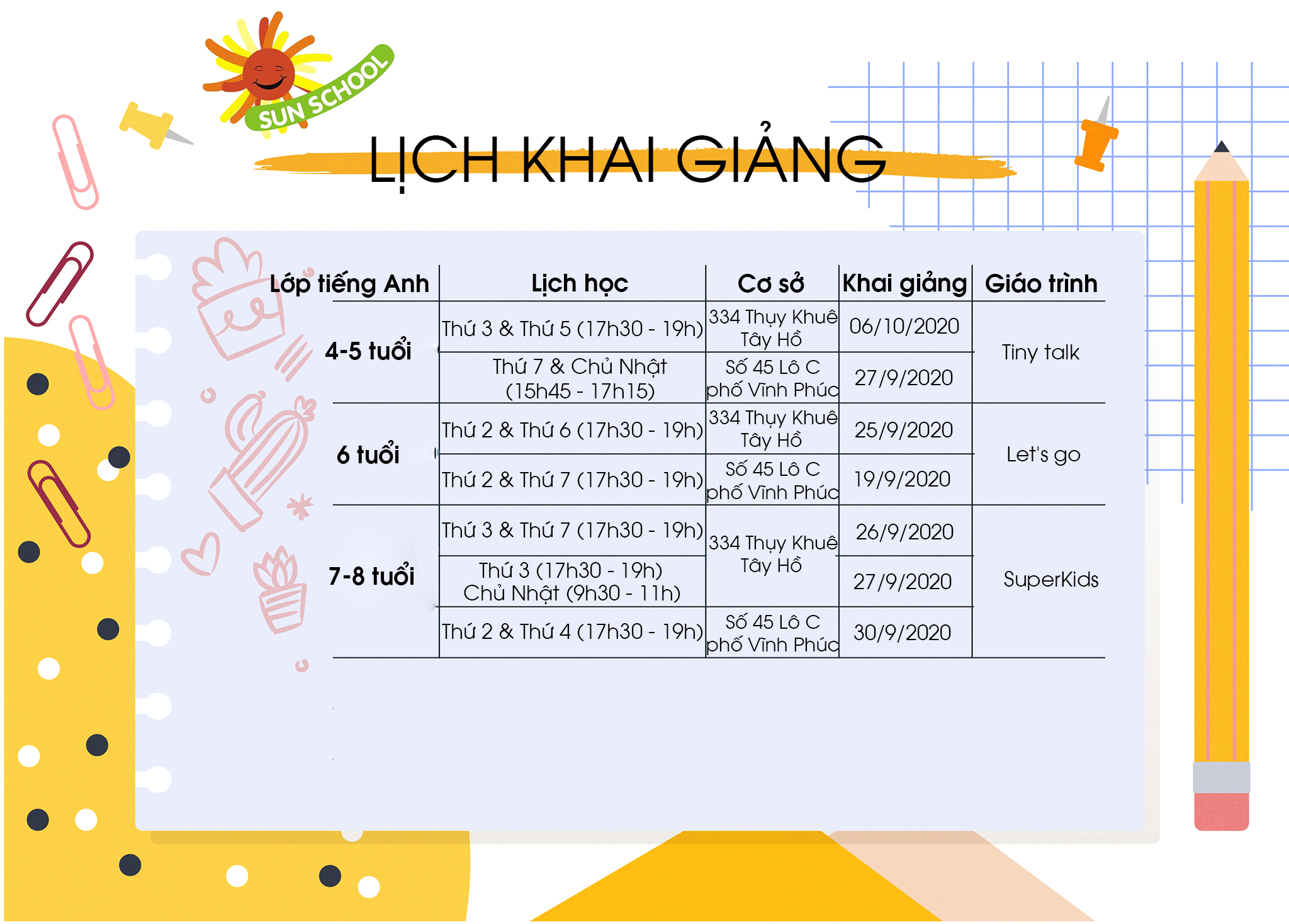 Anh ngữ Sun School gửi tới các bố mẹ lịch khai giảng các lớp tiếng Anh trẻ em 4-5 tuổi, 6 tuổi và 7-8 tuổi vào cuối tháng 9 và tháng 10. Các bố mẹ có nhu cầu đăng ký lớp học cho con xin vui lòng liên hệ Sun School: Hotline: 091.300.8915.