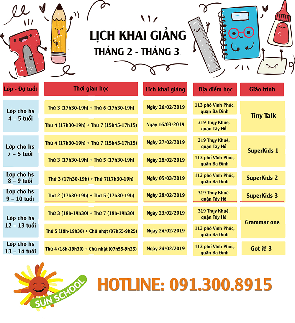 Kính mời Quý phụ huynh tham khảo thông tin các lớp học tháng 2 và tháng 3 bổ ích dành cho con tại Sun School: