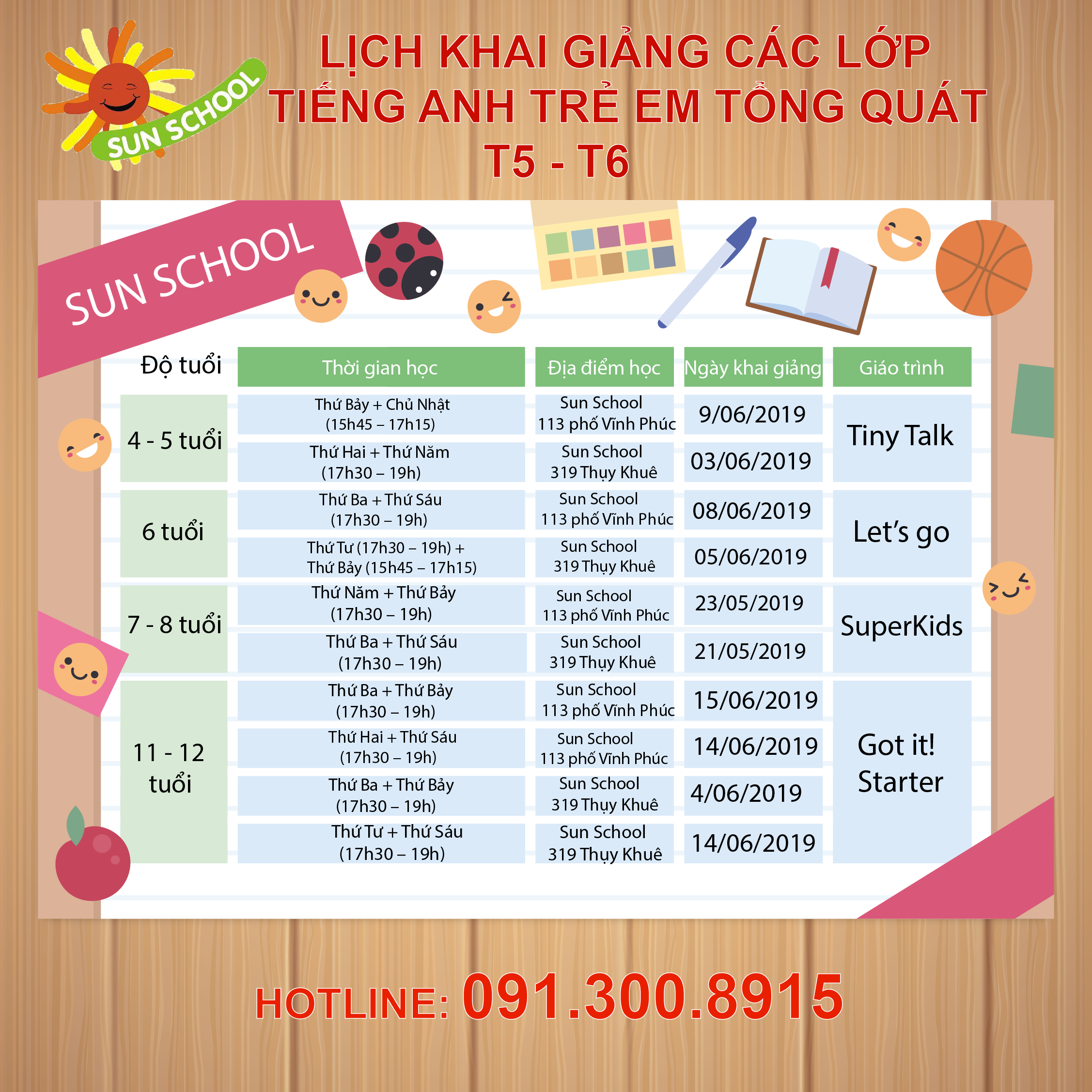 Kính mời Quý phụ huynh tham khảo thông tin các lớp học tháng 5 và tháng 6 bổ ích dành cho con tại Sun School. Các lớp dành cho trẻ độ tuổi từ 4 - 12 tuổi: