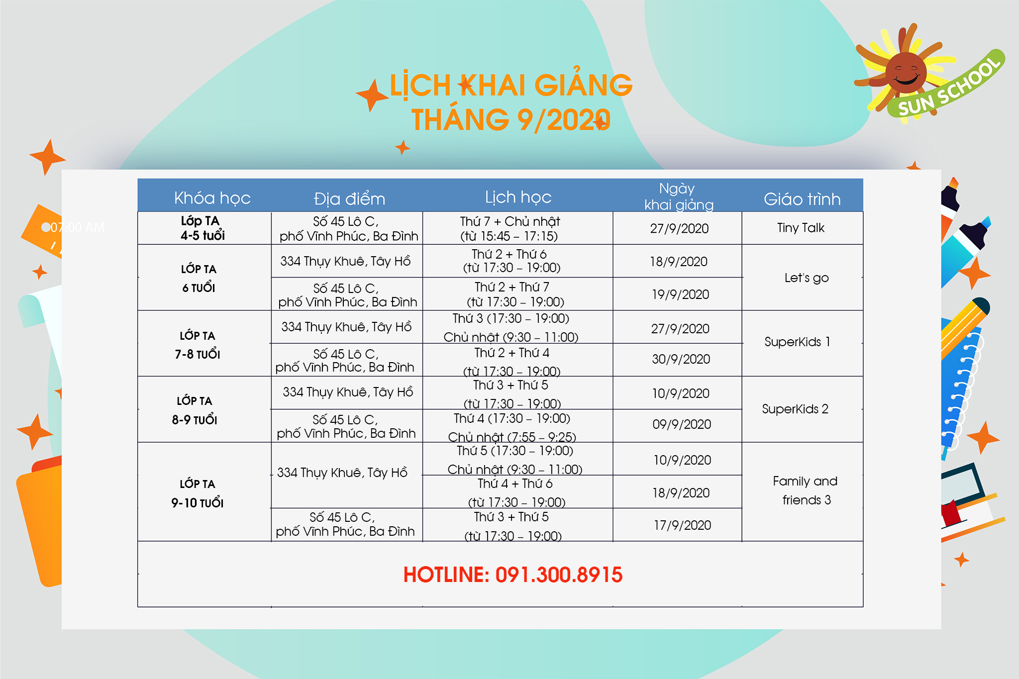 Anh ngữ Sun School gửi tới các bố mẹ lịch khai giảng các lớp tiếng Anh trẻ em từ 4-5 tuổi đến 9-10 tuổi trong tháng 9. Các bố mẹ có nhu cầu đăng ký lớp học cho con xin vui lòng liên hệ Sun School: Hotline: 091.300.8915